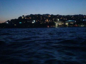 Während Rückfahrt mit Sonnenuntergang über dem Bosporus habe ich dann verstanden, was Orhan Pamuk meint, wenn er von den schwarzen Wassern des Bosporus spricht, denn der Anblick Istanbuls vor den pechschwarzen Wellen ist zum Dahinschmelzen.