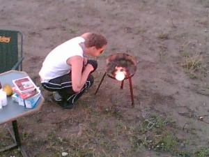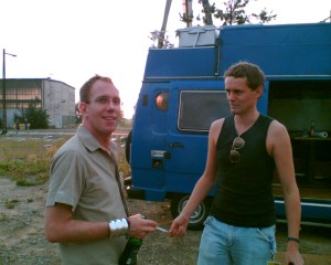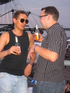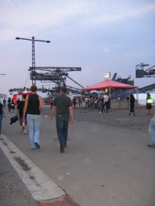 Nun denn, auf einem Bein kann man nicht stehen und so kam es, dass schon kurze Zeit später der ersten Flasche Gaffel Kölsch das Genick gebrochen wurde. Bei einem Zwischenstopp in einem Kaff bei Dessau, wo unsere bezaubernde Mitfahrerin Constanze von ihren Eltern abgeholt wurde, schoß man die ersten Promo-Fotos von unserer Crew. Der Vater der Mitfahrerin hatte eine Canon A100 in Anschlag gebracht und gab den David Hamilton. Als der Bus nach erfolgreicher und zumindest für mich überraschender Presse-Akkreditierung auf das Gelände rollte, hatte Herr E. schon bedenkliche Schlagseite. Die Versuche das Festival zu entern, scheiterten zunächst an einem urplötzlich ausbrechenden Gewitter, das die Band Maximo Park ebenso überraschen sollte, wie den Generator, der die Bühne mit Strom versorgte. Der Legende nach spielten Maximo Park ein Lied akustisch und verschwanden dann zu einer wichtigen TV-Show.