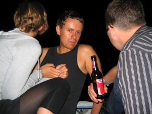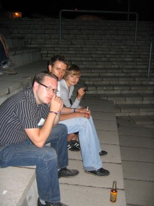 Die Rückfahrt durch herrliche ostdeutsche Kleinstädte, die unheimliche Absenz von Imbissbuden an der B80 und ein famoser Sonnenuntergang rundeten die Rückfahrt und Herrn E.’s Abschlussbesäufnis ab. Herr Elmar Sommer ist übrigens Regisseur der am 11.9.05 im WDR Rockpalast ausgestrahlt werdenden Melt!-Aufzeichnung und dürfte von unserer verdeckten Backup-Operation nichts mitbekommen haben. Wer allerdings die kryptischen Moderationen bezüglich des Melt!-Festival von Klaus Fiehe in Raum und Zeit auf Eins Live zwischen 0:30 und 1:00 Uhr gehört hat, könnte dem Geheimnis der wahren Hintermänner des Melt!-Festivals ein Stück näher gekommen sein.