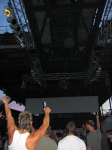 Herr H. eilte mir zur Hilfe und der weitere Abend konnte ohne weiter Zwischenfälle begangen werden. Beziehungsweise gab es insgesamt schon einen musikalischen Zwischenfall: Aus irgendwelchen unerfindlichen Gründen standen plötzlich die Alt-Rocker Laid Back (sic!) auf der Bühne um tatsächlich „Bakerman“ und „Sunshine Reggae“ in Extended Versions zu spielen. Die Umstände dieses Booking kann man wahrscheinlich nur verstehen, wenn man wei?das bald AC/DC auf dem Sportplatz des nahegelegenen Kaffs Oranienbaum spielen und DJ ?Ötzi in Roßlau angepreisen wird. (Bei näherem Hinschauen entpuppten sich beide Double bzw. Cover-Bands). Will sagen: Ohne die im Umland übliche provinziell-retardierte Fehlbuchung kommt wohl auch das Melt!-Festival nicht aus. Die wenigen Laid-Back-Fans dürften dann auch von der ungewöhnlichen Uhrzeit und der Einbettung zwischen den großen Underworld und den Drum n‘ Bass Urgesteinen LTJ Bukem und MC Conrad stark verunsichert gewesen sein.
