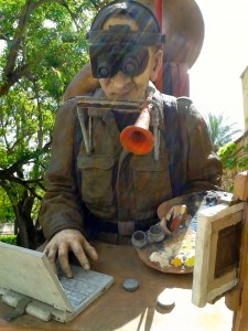 Schon ein paar Mal bin ich an der Skulptur »Como un monumento al artista« von Curro González vorbeigegangen. Sie steht im Hof des CAAC – Centro Andaluz de Arte Contemporáneo in Sevilla. Beim ersten und zweiten Mal habe ich sie als aufdringlich und etwas plump empfunden – zu sehr Hyperrealismus. Aber gestern – thematisch vorbelastet durch unsere Blogdebatte »Intrinsisches Entertainment« habe ich ihre Bedeutung und Komplexität voll erfasst.